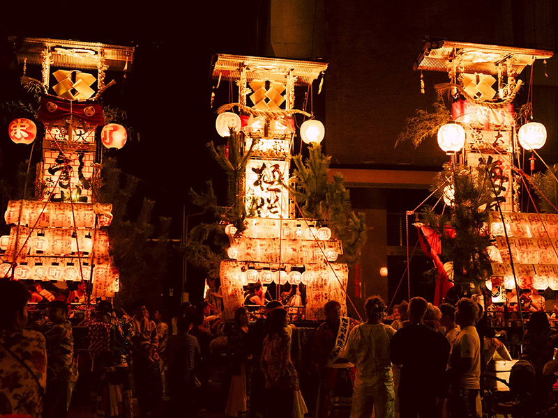 珠洲に生まれ育った人は、「正月と盆に帰ってこなくても、祭りには帰ってこい」と言われるほど、大切にされている祭り。キリコ、燈籠山、曳山など、地区によって様々な特徴があり、高さ約 15m 以上の巨大なキリコもあります。地元食材を使ったご馳走を、身内や来てくれた人に赤御膳で振舞う「ヨバレ」という風習も残っています。